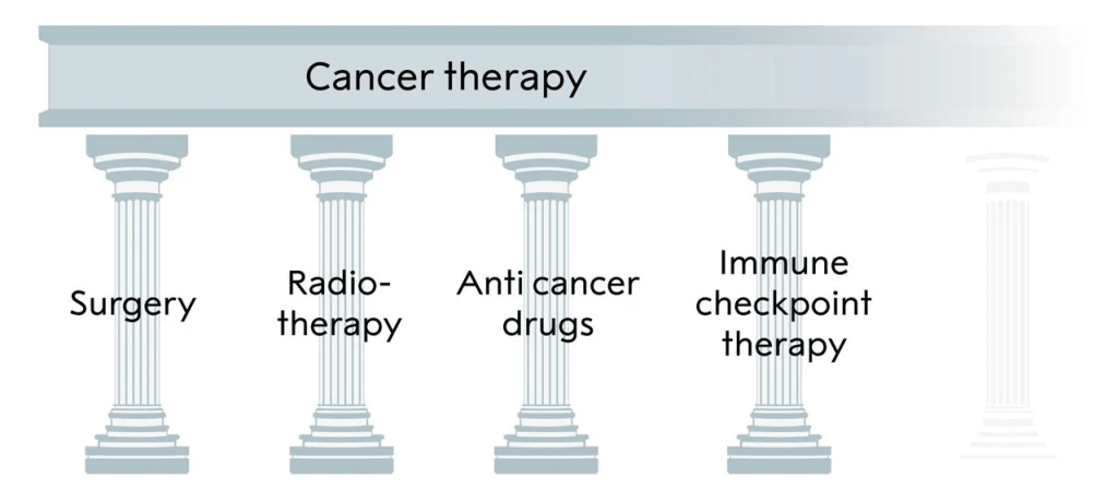 The three pillars of cancer treatment, all directed against the cancer cell, and the fourth, immune checkpoint inhibitor, based on unleashing an immune response against the tumor.